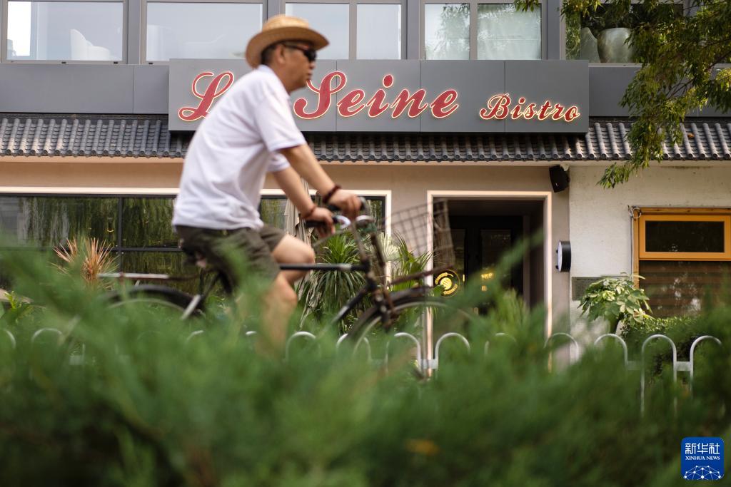 這是一名市民騎車經過北京亮馬河畔一家名叫“塞納河”的西餐廳(6月25日攝)。