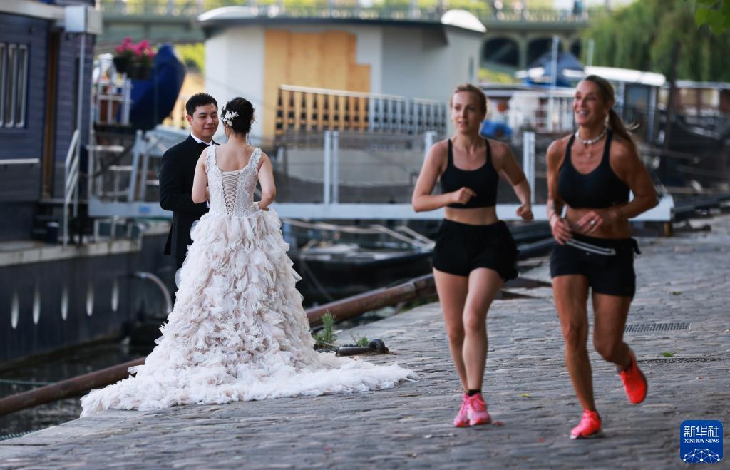 這是一對來自中國的新人在法國巴黎塞納河邊拍攝婚紗照(6月27日攝)。