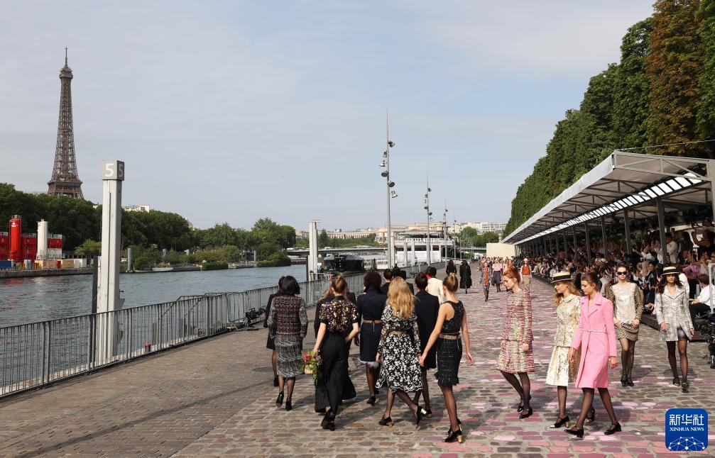 這是在法國巴黎塞納河邊拍攝的法國品牌香奈兒時裝秀(7月4日攝)。