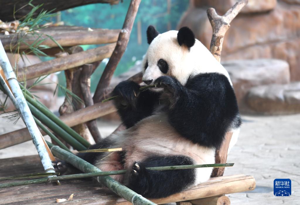 7月13日,一隻大熊貓在廣西南寧市動物園空調房裏享受美食。