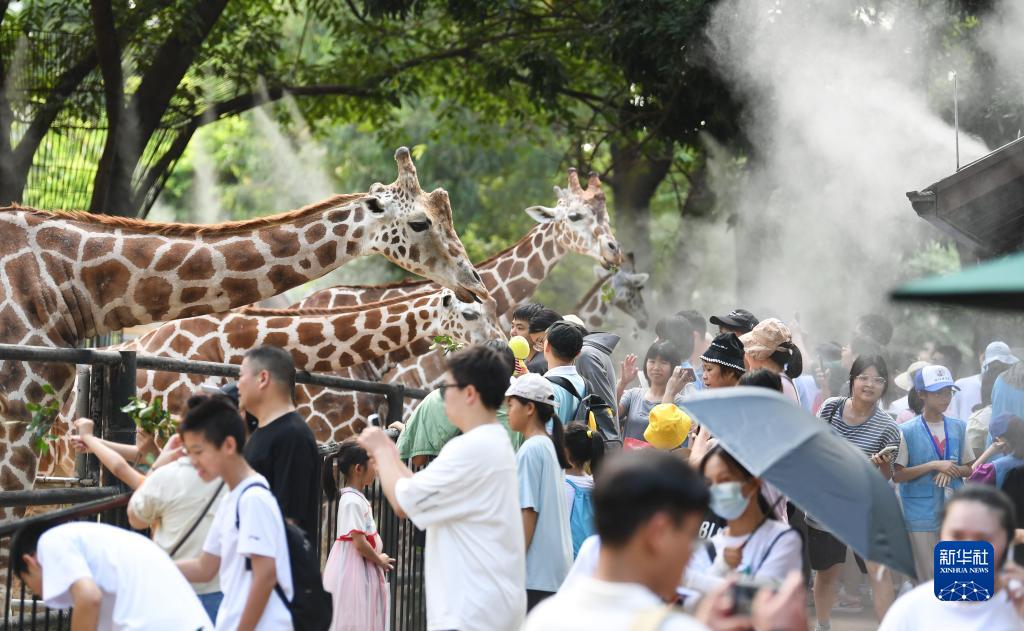 7月13日,廣州動物園採用降溫噴霧給長頸鹿避暑。