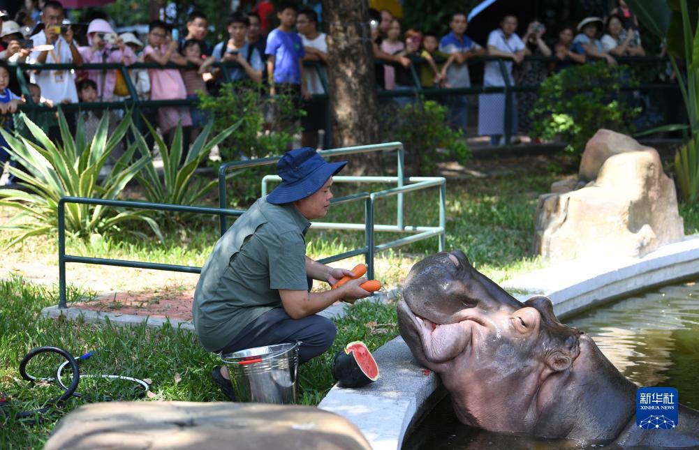 7月13日,廣州動物園飼養員給河馬投喂胡蘿蔔和西瓜。