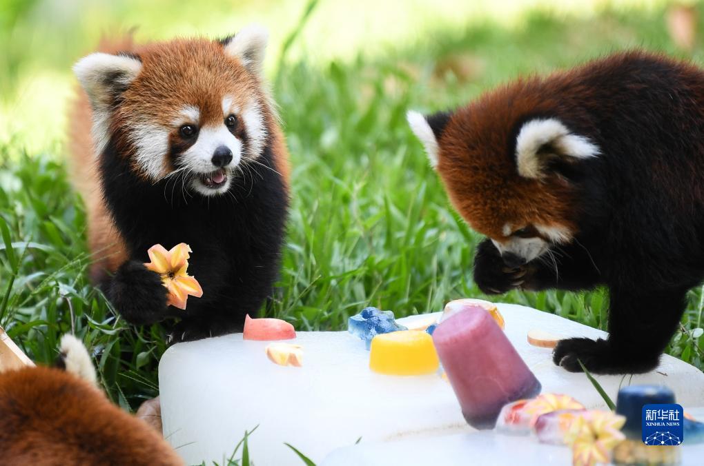 7月13日,廣州動物園裏的小熊貓享用冰鎮水果。