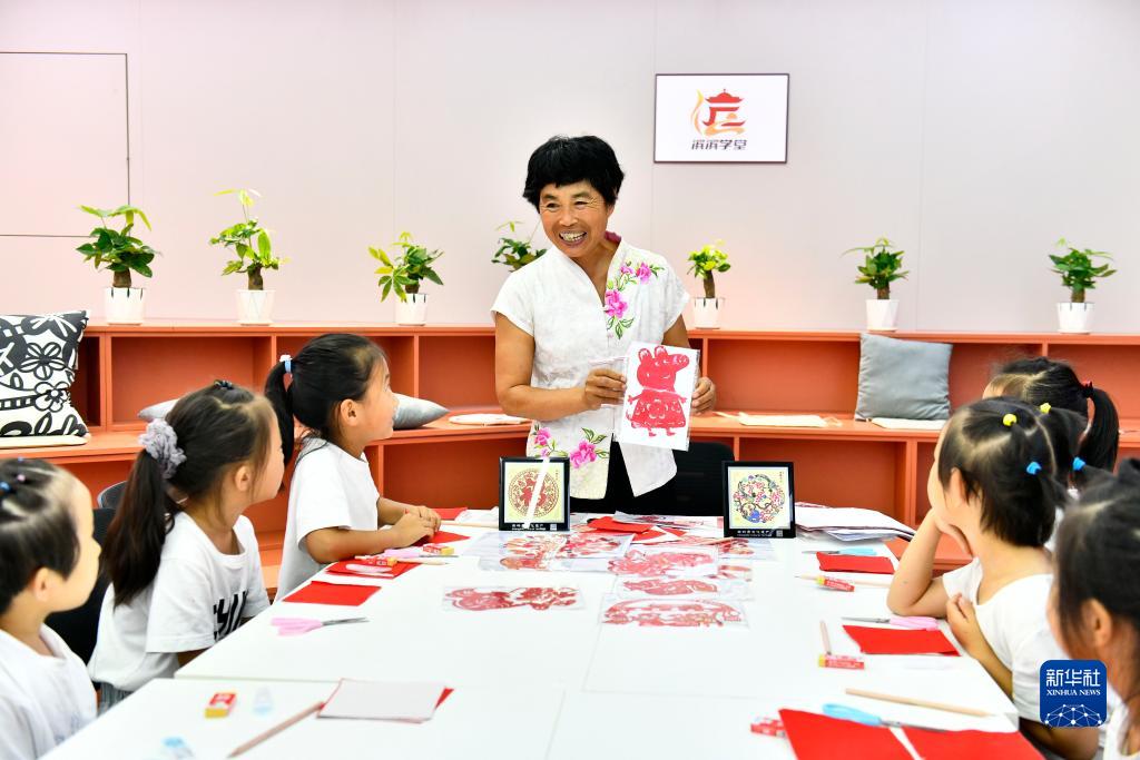 7月13日,在惠民縣姜樓鎮一處“濱濱學堂”,公益講師張士翠教孩子們剪紙。