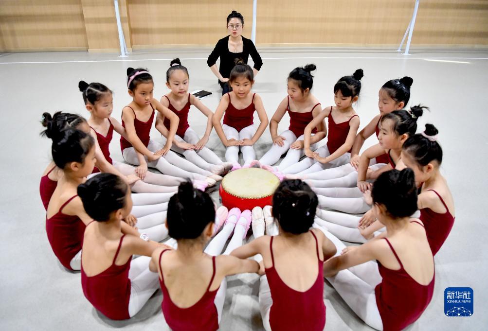 7月12日,在安徽省亳州市青少年活動中心舞蹈室,孩子們在老師的指導下學習舞蹈基本功。