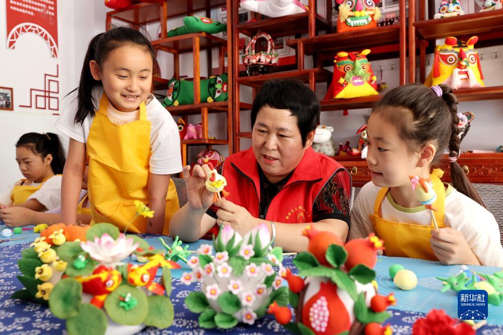7月13日,孩子們在山東省棗莊市龍山路街道民間藝術志願者工作室學習面塑製作技藝。