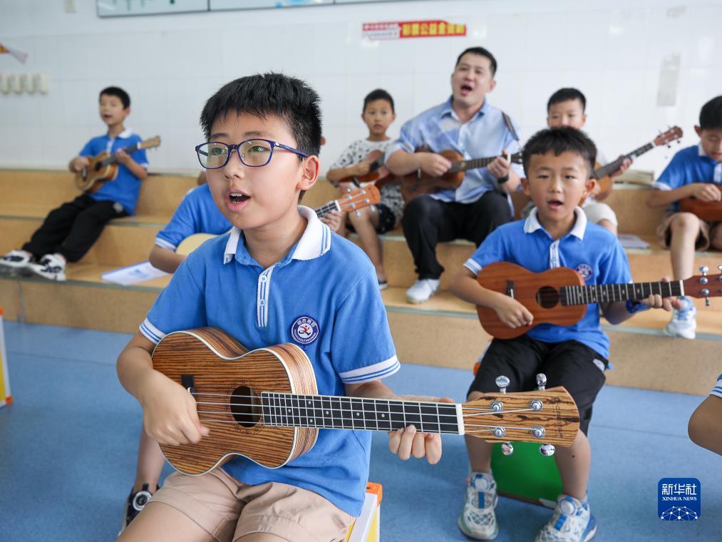 7月13日,河南省安陽市高新區銀杏小學南校學生在暑期延時服務課上彈奏尤克裏裏。