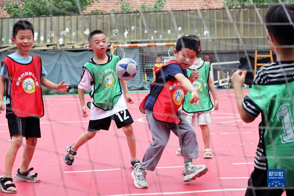 7月13日,浙江省湖州市德清縣乾元鎮一家幼兒園的孩子們在玩手球運動游戲。