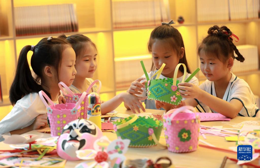 7月13日,四川省仁壽縣的孩子們在暑托班製作花籃。
