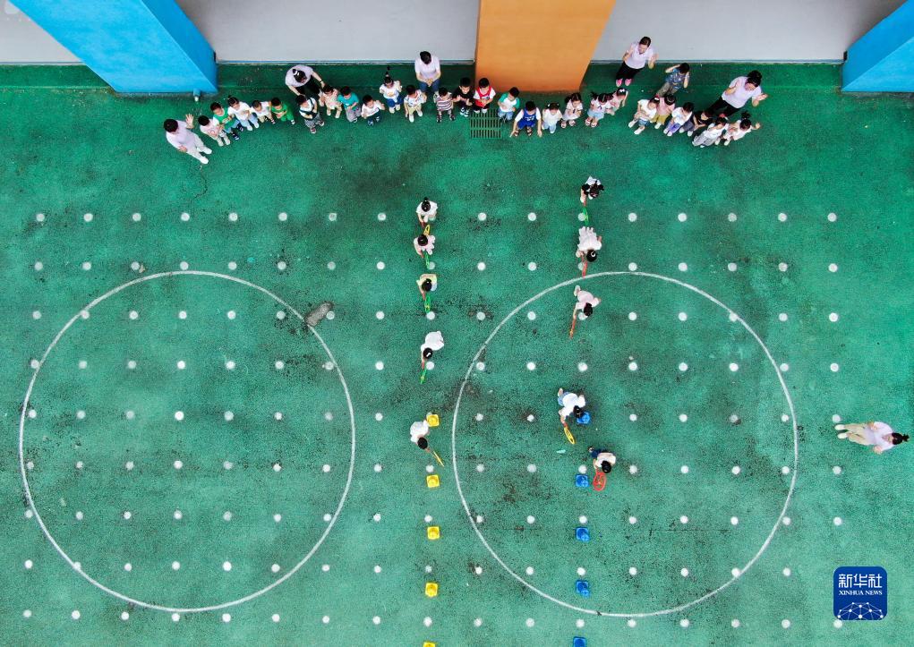 7月13日,在安徽省合肥市肥西縣山南鎮中心幼兒園,孩子們在玩滾鐵環游戲(無人機照片)。