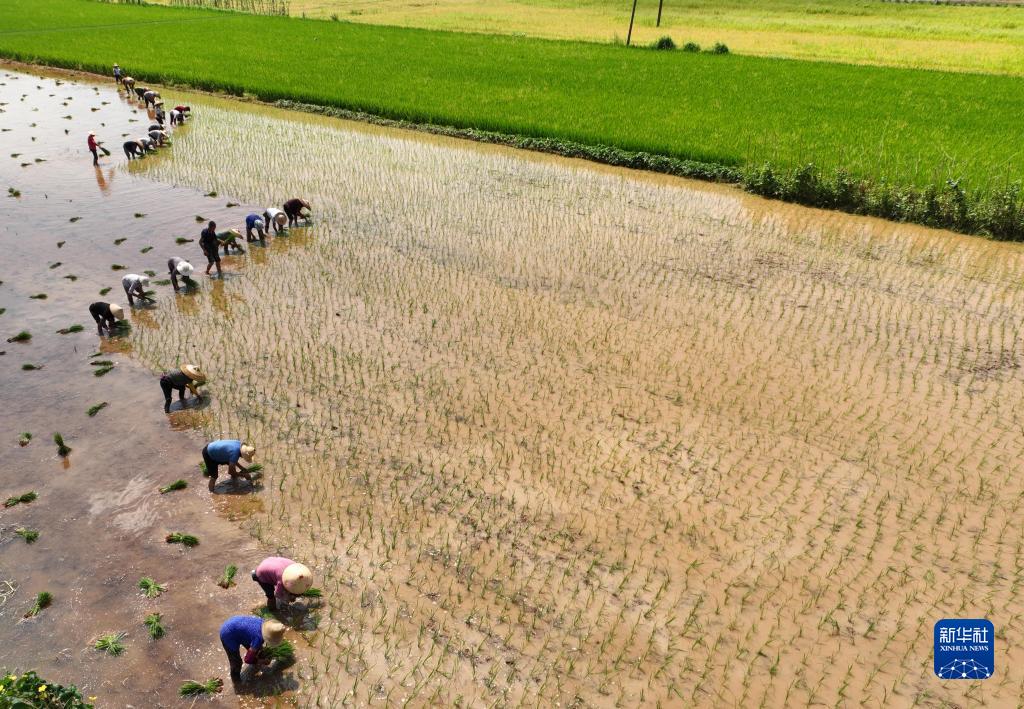 7月12日,在衡陽市祁東縣金橋鎮,當地村民在搶插晚稻(無人機照片)。
