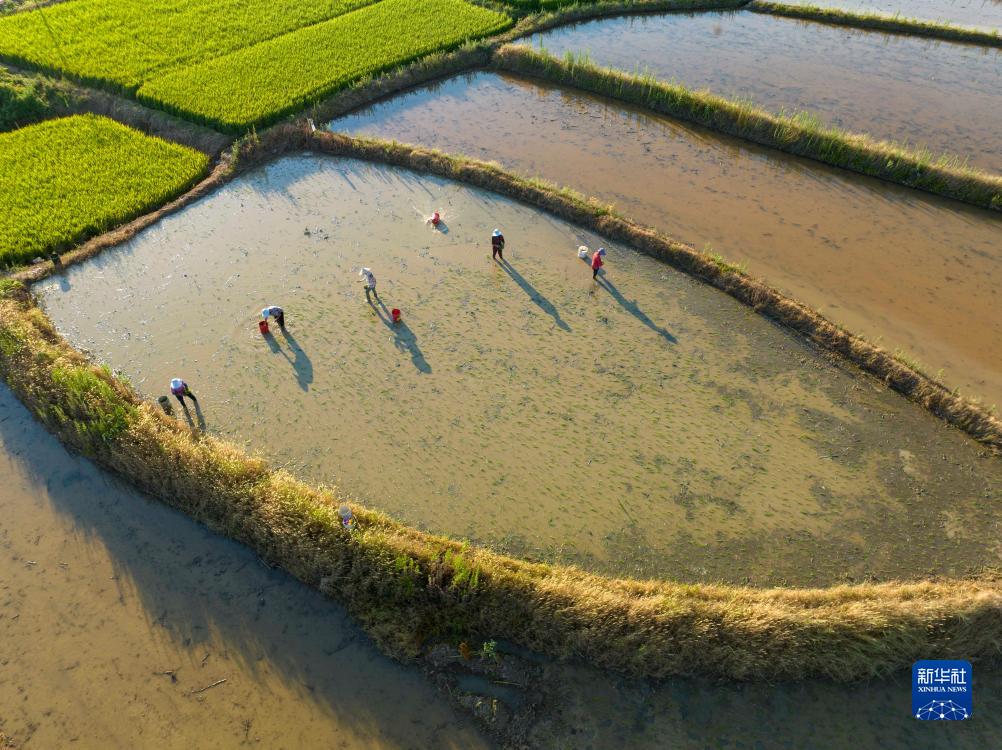 7月12日,在永州市道縣蚣壩鎮光家嶺村,農民在拋種晚稻(無人機照片)。