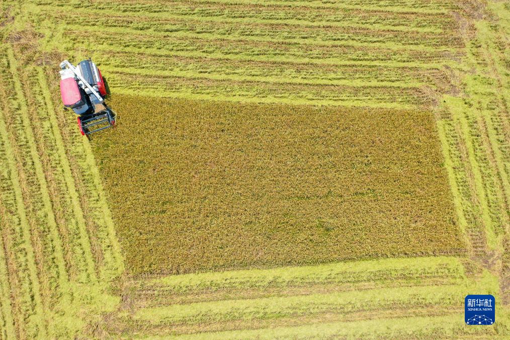 7月13日,在衡陽市衡陽縣&源鎮&九村,村民駕駛農機在田間收割早稻(無人機照片)。