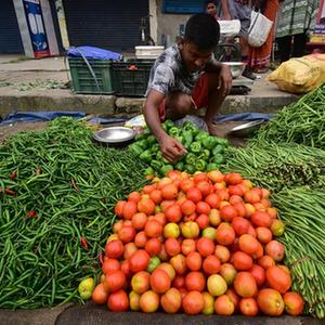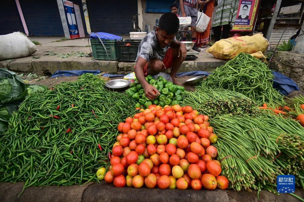 7月13日,印度阿薩姆邦首府高哈蒂的商販在街頭販賣西紅柿及其他蔬菜。