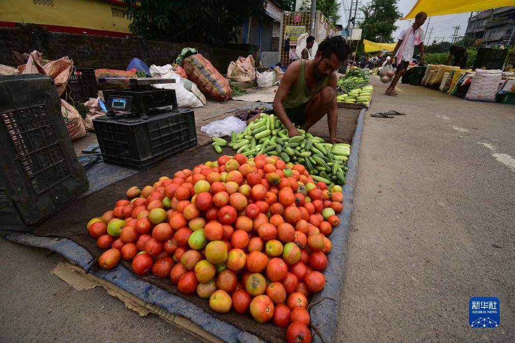 7月13日,印度阿薩姆邦首府高哈蒂的商販在街頭販賣西紅柿及其他蔬菜。