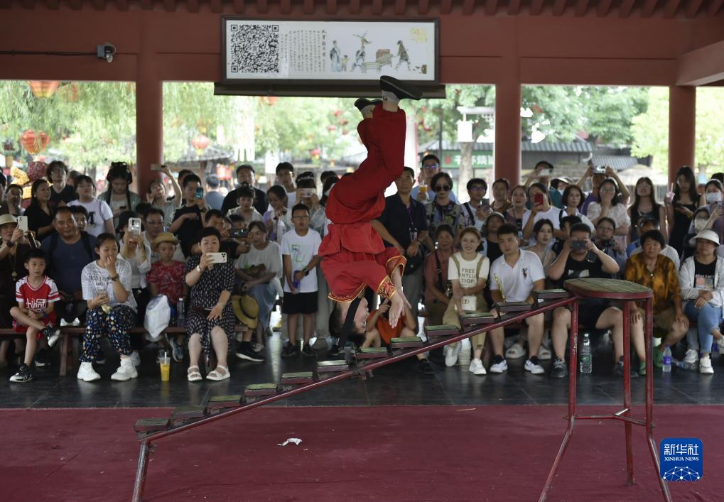 7月13日,游客在開封市清明上河園景區內觀賞雜技表演。