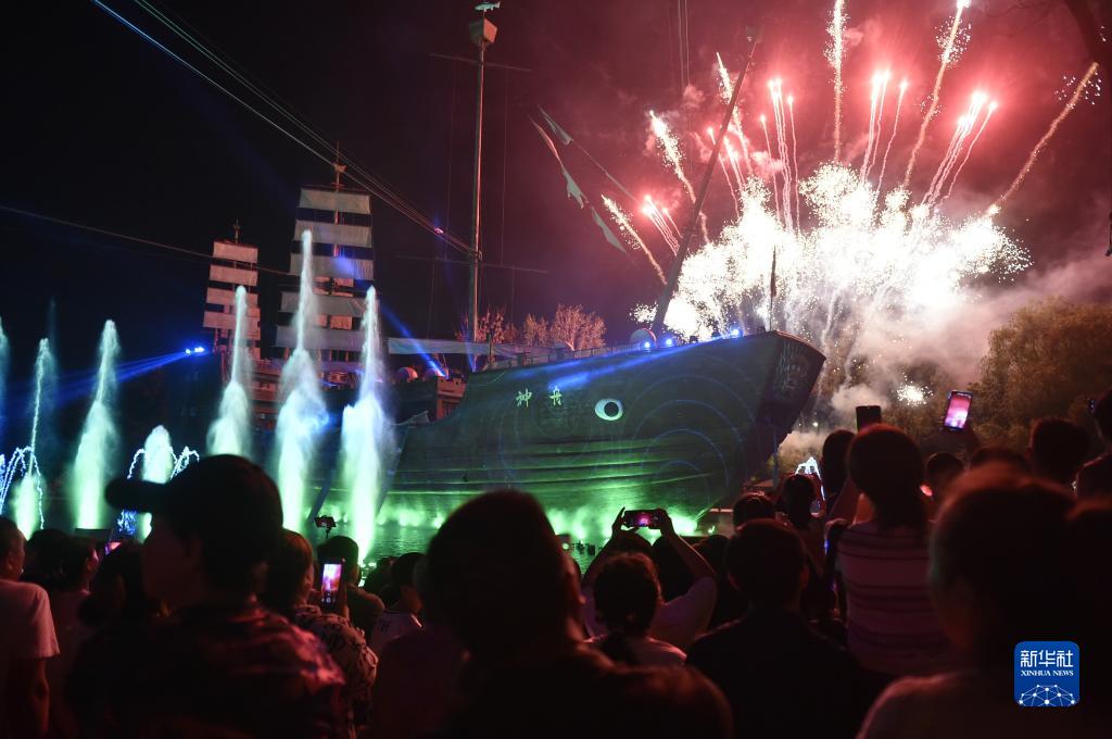 7月13日晚,游客在開封市萬歲山大宋武俠城景區內觀賞戶外實景表演。