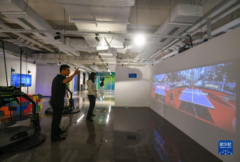 7月13日,在成都大運會主媒體中心的休閒娛樂區,兩名媒體記者在體驗互動投影乒乓球。