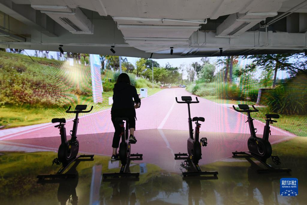 7月14日,媒體工作人員在成都大運會主媒體中心休閒娛樂區內體驗騎行。