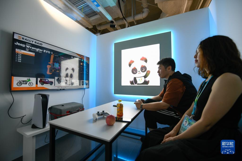7月14日,媒體工作人員在成都大運會主媒體中心休閒娛樂區內游玩。