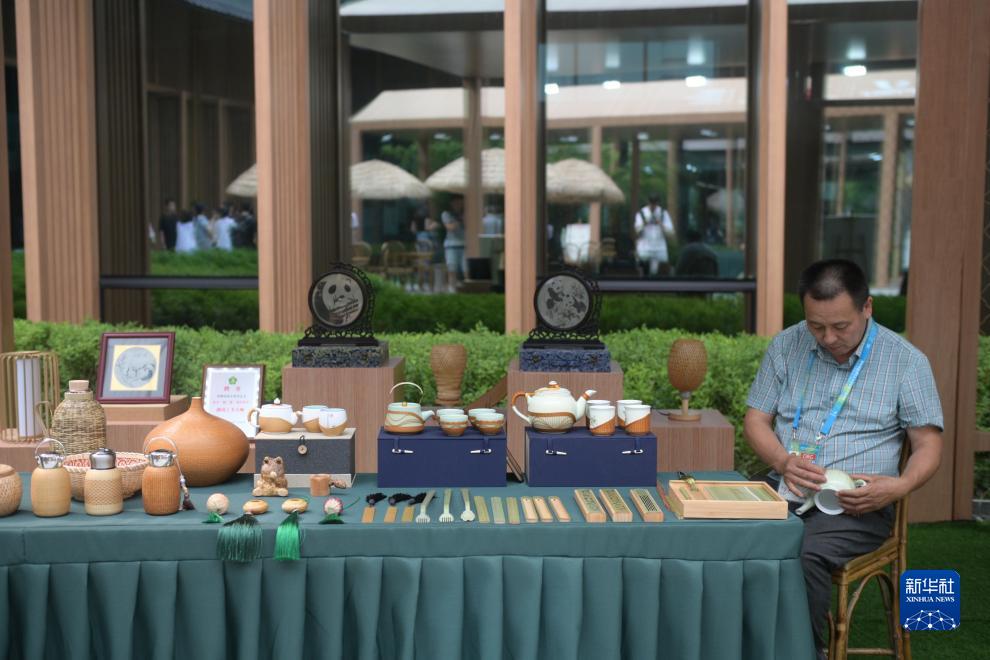 7月12日,在主媒體中心傳統文化傳播區,一位手工藝人正在進行瓷胎竹編展示。