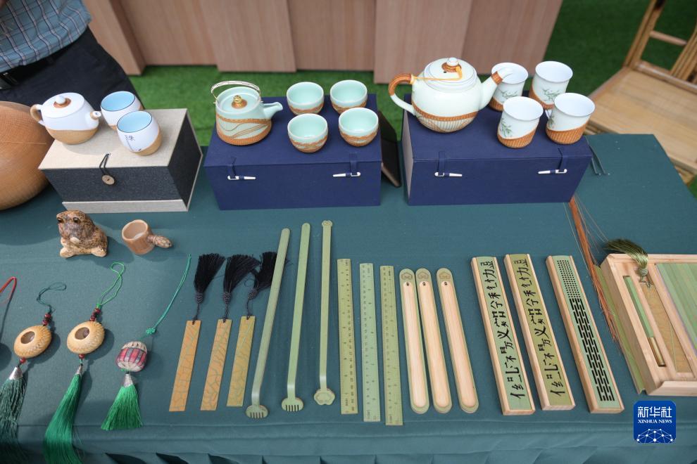 這是7月12日拍攝的主媒體中心傳統文化傳播區的四川竹編産品展示。