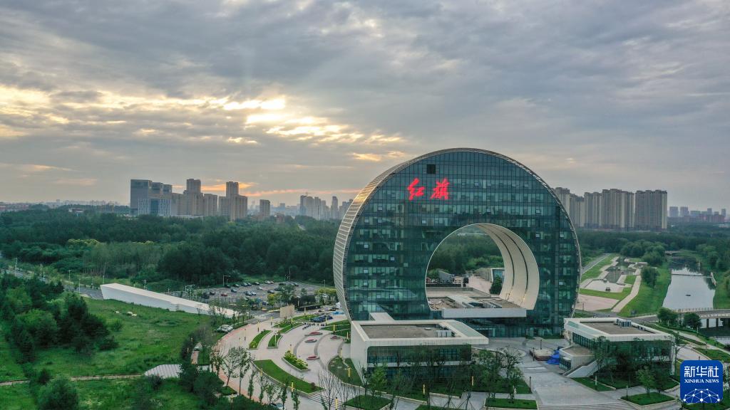 7月13日無人機拍攝的晨曦中的一汽紅旗創新大廈。