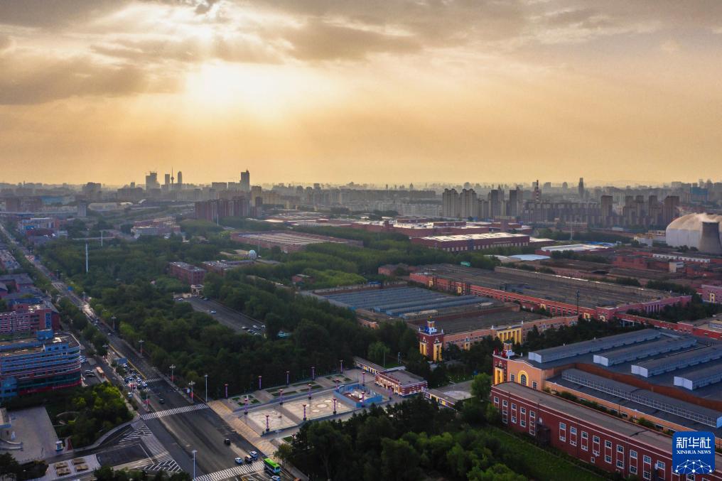 無人機拍攝的晨曦中的一汽老廠區景象(7月6日攝)。