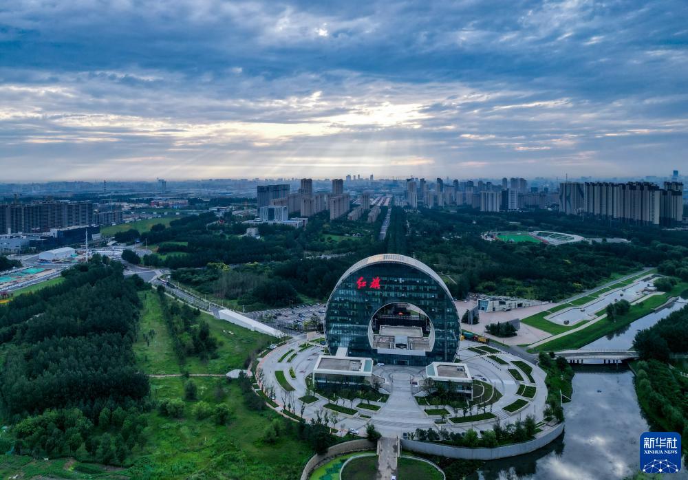 無人機拍攝的晨曦中的一汽紅旗創新大廈(7月13日攝)。