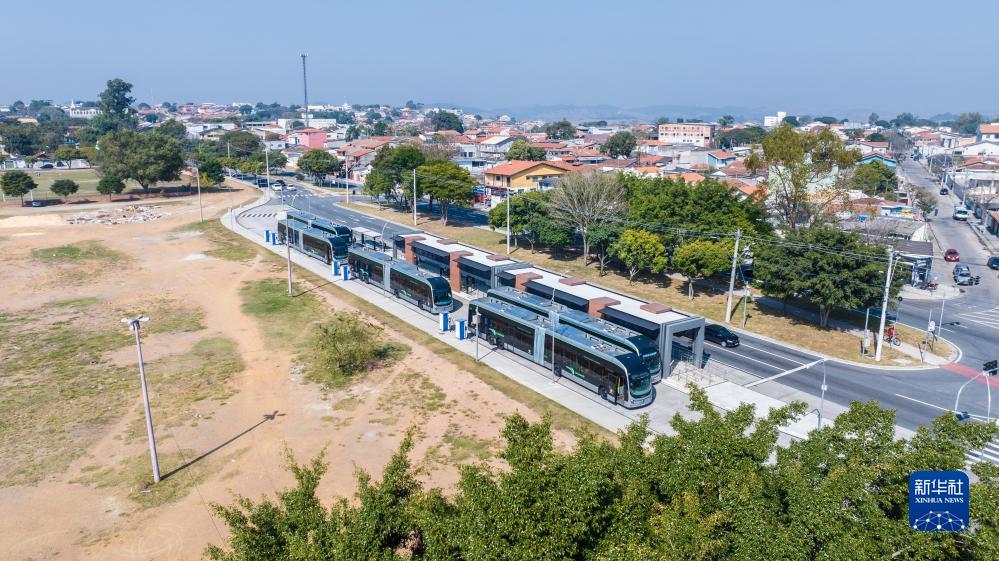 這是7月12日在巴西聖保羅州聖若澤杜斯坎普斯快速公交系統“綠線”始發站拍攝的比亞迪純電動大巴(無人機照片)。