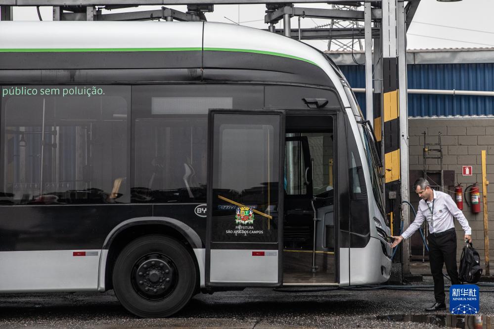 7月12日,在巴西聖保羅州聖若澤杜斯坎普斯,工作人員檢查比亞迪純電動大巴車況。