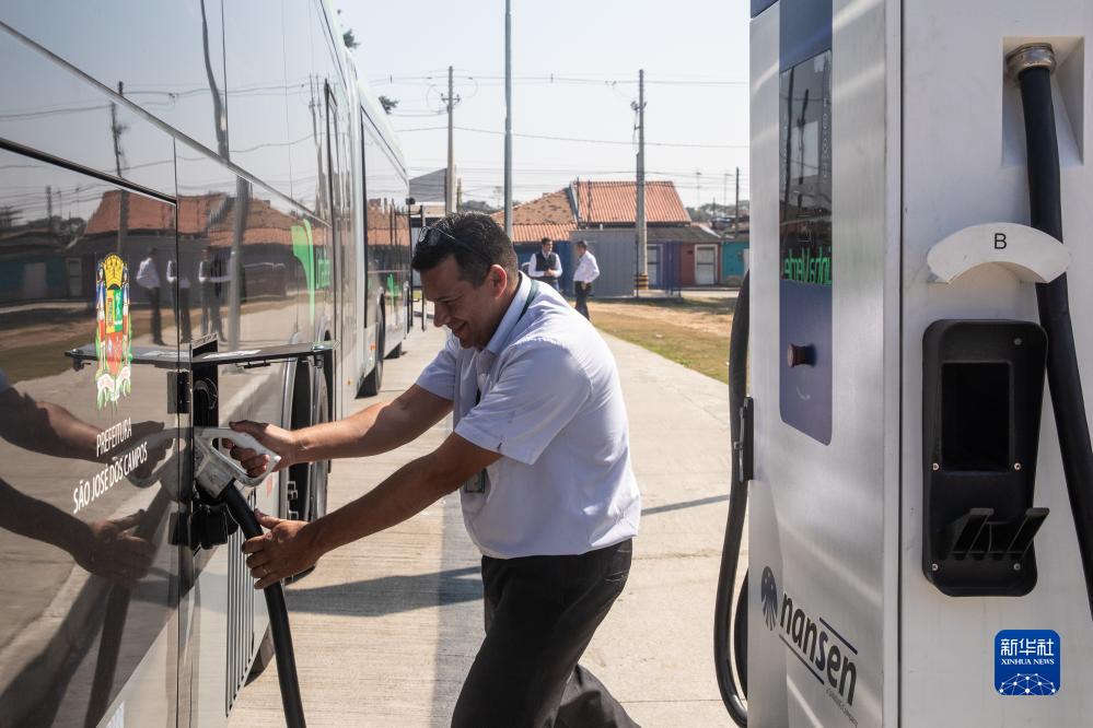 7月12日,在巴西聖保羅州聖若澤杜斯坎普斯,工作人員為比亞迪純電動大巴充電。