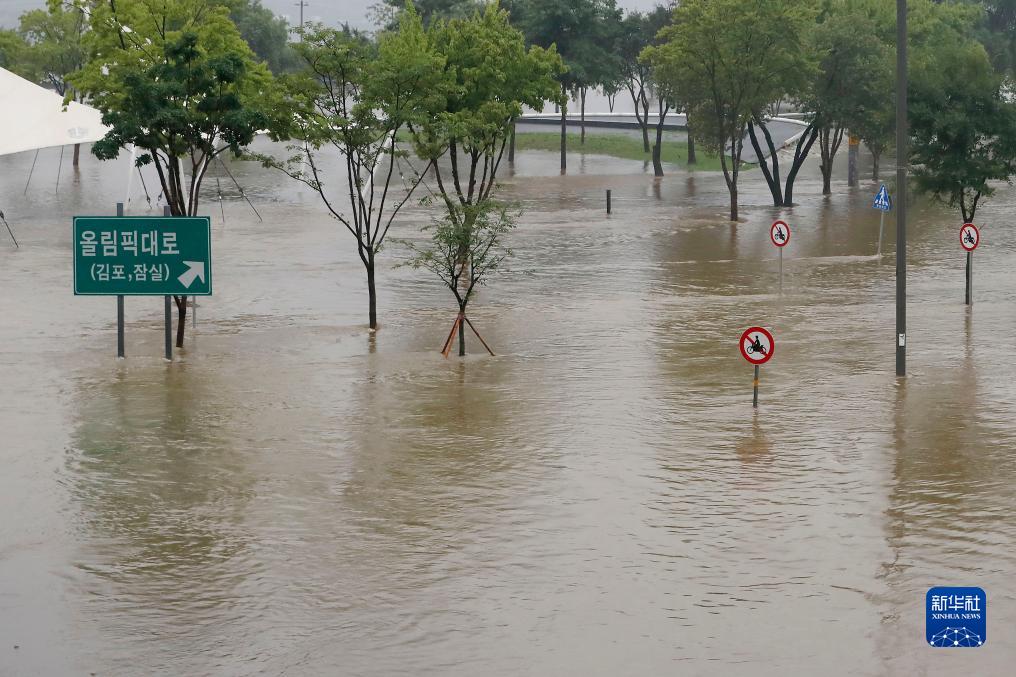 這是7月14日在韓國首爾拍攝的被水淹沒的盤浦漢江公園。