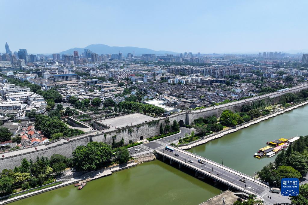 南京中華門城堡與秦淮河景色(無人機照片,6月9日攝)。