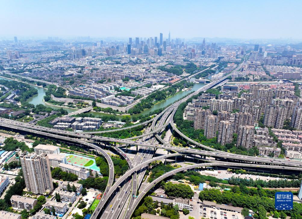 南京雙橋門立交樞紐與明城墻、城市景色(無人機照片,6月9日攝)。