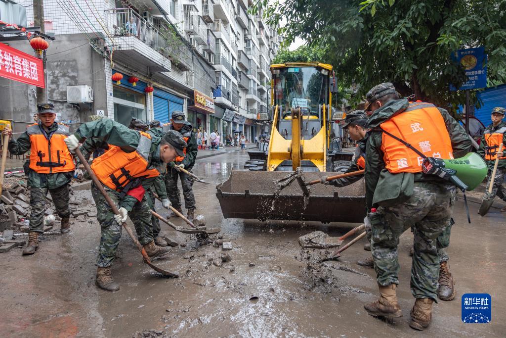 7月14日,在重慶市萬州區五橋街道五間橋社區,武警重慶總隊船艇支隊官兵在洪水退去後清淤。