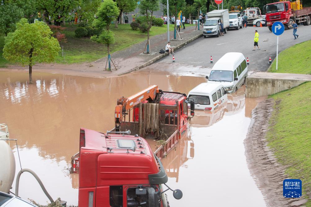 7月14日,在重慶市萬州區江南新區,停靠在路邊的部分車輛陷在洪水淤泥裏。