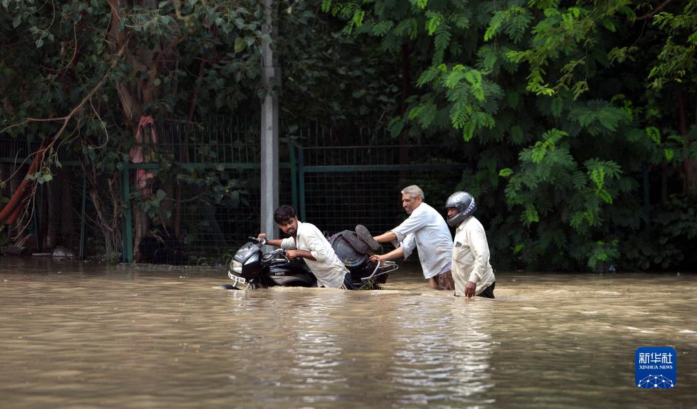 連續強降雨導致亞穆納河水位上漲,新德里部分地區被淹,市民出行和日常生活受到影響,低窪區受災居民排隊領取生活物資。