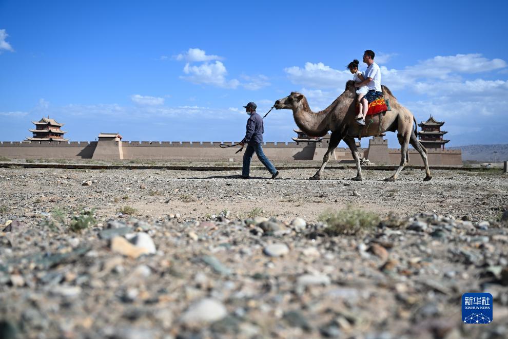 游客在嘉峪關關城景區體驗騎駱駝(7月13日攝)。
