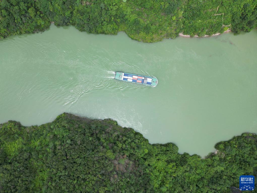 集裝箱貨輪從貴州省遵義市余慶縣沙灣碼頭駛出,前往重慶涪陵黃旗港(7月14日攝,無人機照片)。