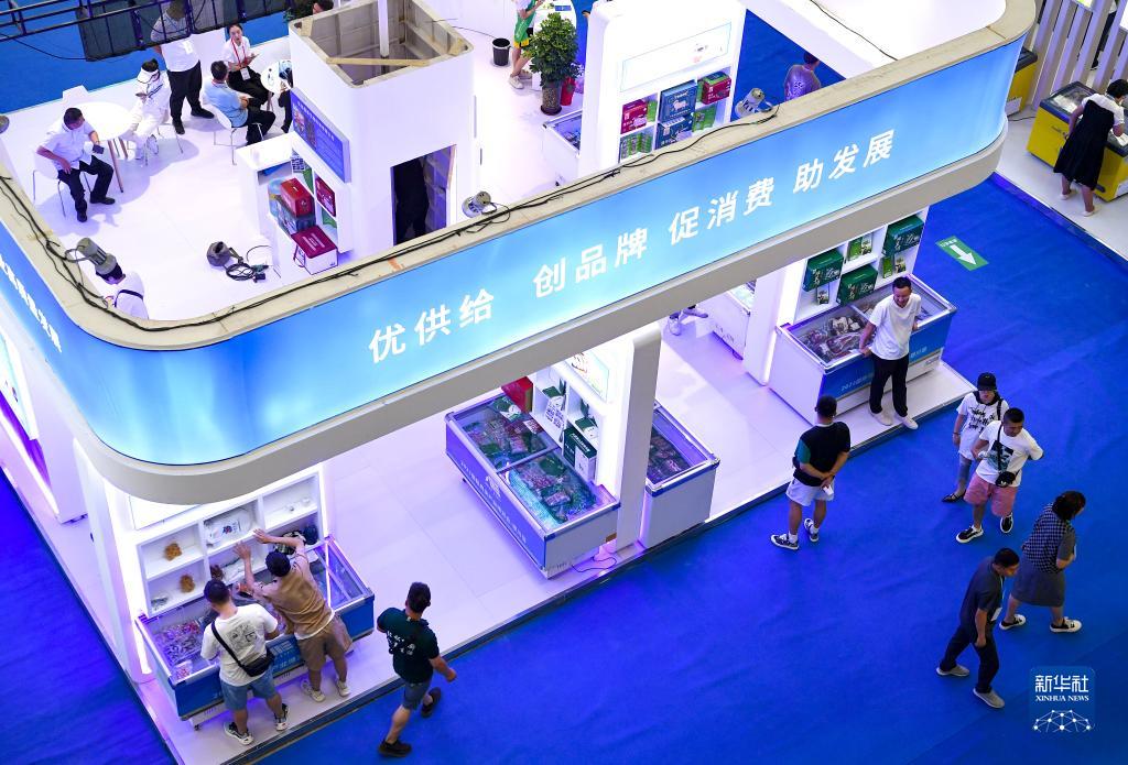 7月14日,參觀者在博覽會現場觀看展出的商品。