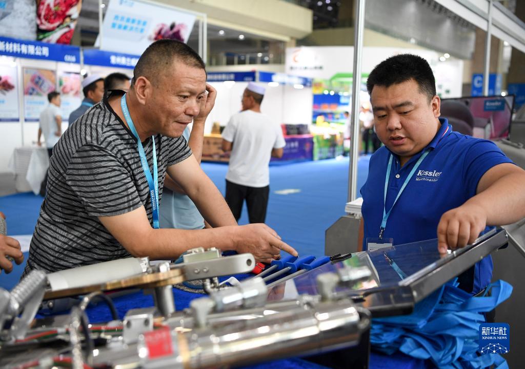 7月14日,採購商在博覽會現場了解肉類加工設備。