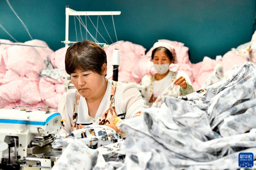 7月14日,在惠民縣胡集鎮河東村,村民在加工床笠。