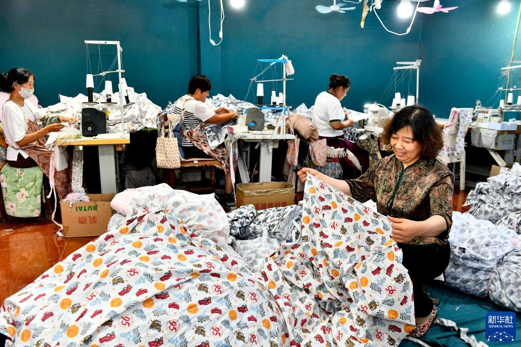7月14日,在惠民縣胡集鎮河東村,村民在加工床笠。