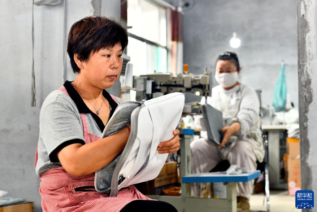 7月14日,在惠民縣胡集鎮胡集村,村民在加工電腦包。