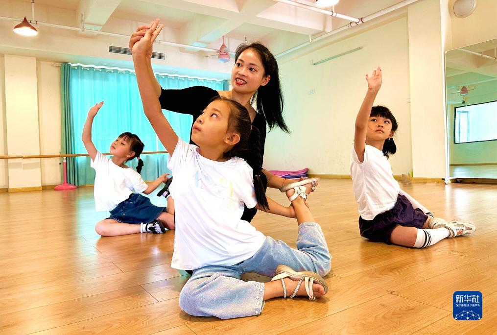 7月14日,在四川省眉山市仁壽縣一家舞蹈室,孩子們在老師的指導下練習舞蹈基本功。