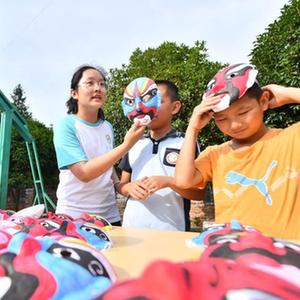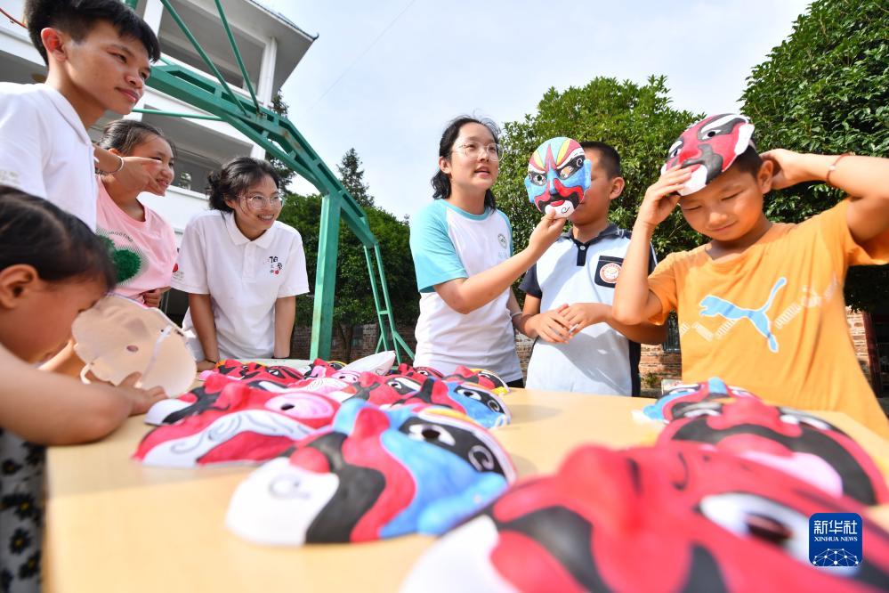 7月14日,在三江侗族自治縣知了小學,孩子們在展示自己的臉譜作品。