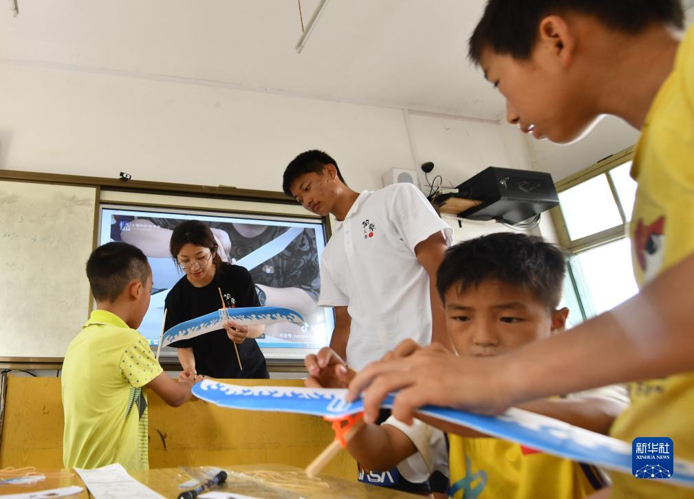 7月14日,在三江侗族自治縣知了小學,南通大學學生在給孩子們上“夢想課堂”。