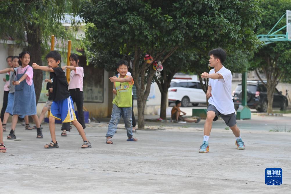 7月14日,在三江侗族自治縣知了小學,南通大學學生教孩子們學習武術。