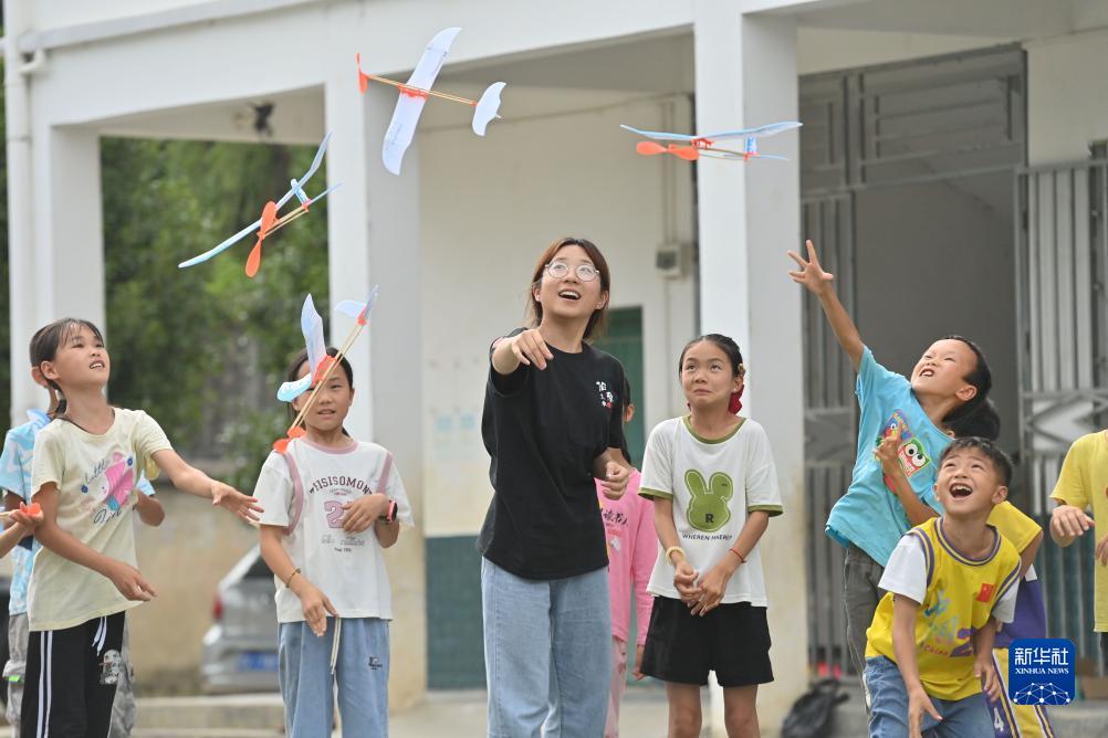 7月14日,在三江侗族自治縣知了小學,南通大學學生帶着孩子們“放飛夢想”。